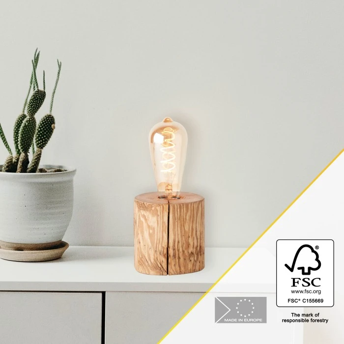Die Tischleuchte Trabo lässt sich auf vielfältige Weise in den Wohnbereich integrieren, sei es als stimmungsvolle Beleuchtung auf dem Nachttisch oder als Akzentbeleuchtung im Wohnzimmer. Die Verarbeitung des Werkstoffs Holz lässt eine attraktive Kombination aus Natur und Technik entstehen. Das Holz stammt aus nachhaltiger Forstwirtschaft und ist FSC-zertifiziert. Dieses Siegel des „Forest Stewardship Council“ bedeutet, dass das eingesetzte Holz dieser Leuchte ausschließlich aus verantwortungsvoll bewirtschafteten Wäldern stammt. Der Ursprung des Materials ist vom Wald bis zur Lieferung nachverfolgbar.