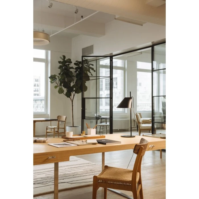 Die Leuchte strahlt vornehmlich blendfreies Licht nach unten ab. Die Position des Schirms kann angepasst werden, um den Winkel der Lichtabstrahlung zu optimieren. Eine schmale Öffnung im oberen Teil des Schirms strahlt ein weiches, nach oben gerichtetes Umgebungslicht ab. Ein einfaches mechanisches System sorgt für viel Bewegungsfreiheit, sodass Sie das Licht an Ihrem Arbeitsplatz, im Wohnzimmer usw. immer ideal ausrichten können. Die integrierte LED-Technik gewährleistet eine hohe Lichtqualität mit einer stufenlosen Dimmung zwischen 15 und 100 %. Die Timerfunktion schaltet das Licht automatisch nach vier oder acht Stunden ab. Es kann eine feste Helligkeitsstufe eingestellt werden, mit der die Leuchte jedes Mal eingeschaltet wird, wenn sie an das Stromnetz angeschlossen wird. Im oberen Teil der Stange befindet sich eine Taste, die als Schalter und Dimmer fungiert.