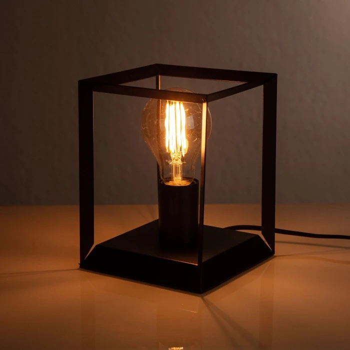 Diese Tischleuchte überzeugt durch eine äußerst elegante Optik und lässt sich ideal in ein modernes Wohnambiente einfügen. Allgemein sind Tischleuchten, wie diese, eine praktische Lichtquelle und sorgen für punktgenaue Beleuchtung an Ort und Stelle. Das schlichte Design dieser Tischleuchte zeichnet sich durch die klaren Linien sowie die einheitliche Farbgebung in Schwarz aus. Die Lichtquelle ist hierbei eingerahmt von schmalen Metallstreben, deren Kanten zusätzlich abgeschrägt sind, was zum optischen Highlight wird. Durch die offenen Seiten ist der Blick auf das Leuchtelement vollkommen frei und das Licht kann ungehindert in den Raum strahlen. Hierbei empfiehlt es sich auf Leuchtmittel in Filamentoptik zurückzugreifen, die den eleganten Charakter dieser Leuchte noch zusätzlich unterstreichen.